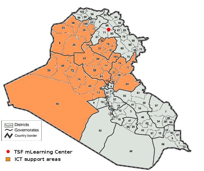 Quatre terminaux satellitaires mobiles ont été déployés avec les équipes de réponse rapide de l’OIM dans les gouvernorats de Kirkouk, Diyâlâ, Anbar et Ninive, alors occupés par les djihadistes (en orange sur la carte).