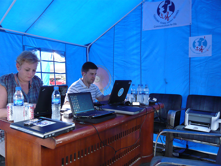Le centre a été ouvert dès le 29 septembre sous une tente à l’extérieur du siège du NDCC en raison du manque de place dans leurs locaux. Ce Centre a été transféré quelques jours plus tard dans un gymnase transformé en Centre de coordination des opérations sur le terrain (OSOCC) afin de permettre l’accueil des nombreux humanitaires supplémentaires. Initialement assurée via satellite, la connexion a été transférée vers la connexion du siège du NDCC le 3 octobre - dans un souci de gestion des coûts – et un câble a été tiré vers le gymnase afin de partager la connexion. TSF a fourni un soutien technique aux utilisateurs du centre jusqu’au 10 octobre, date à laquelle un technicien de APHP a pris le relais. Pour ne pas perturber le bon fonctionnement du centre, TSF a fait don d’un routeur Wi-Fi assurant ainsi une continuité de service.