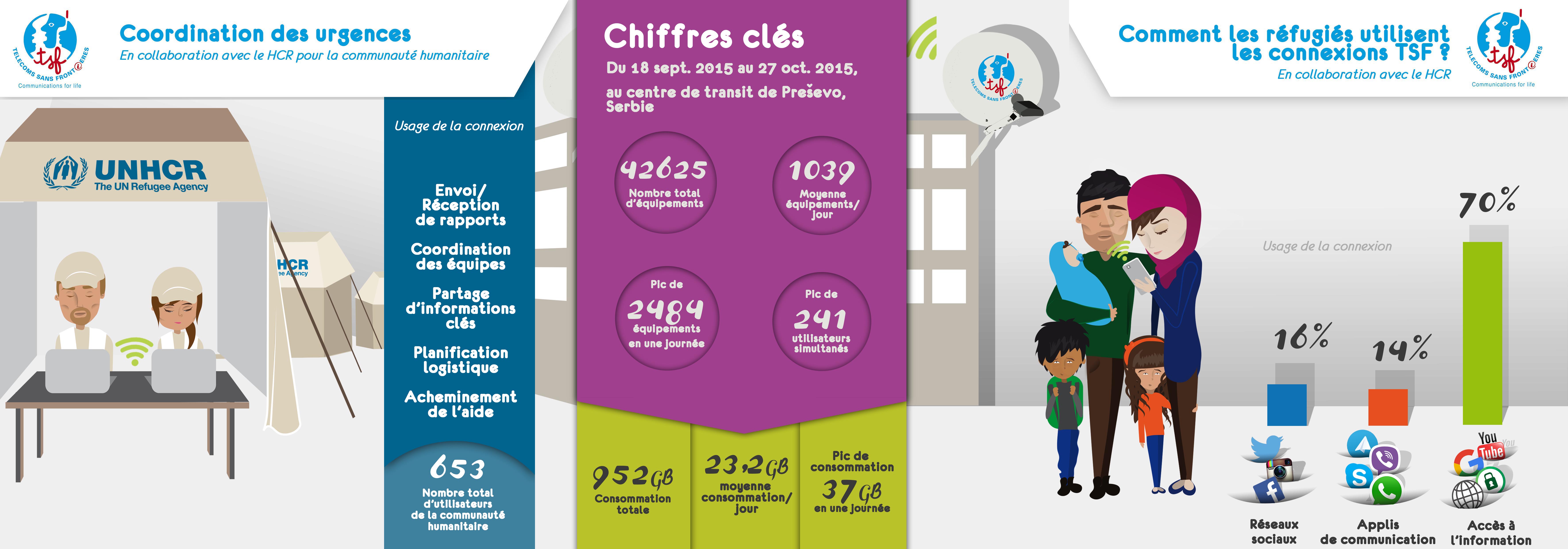 In September 2015, a first satellite internet connection was installed by TSF in the Preševo One-Stop Centre in Serbia, where a vast majority of refugees passed along their route. TSF then developed a technical solution capable of supporting several hundred mobiles simultaneously connected to a Wi-Fi connection.